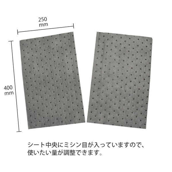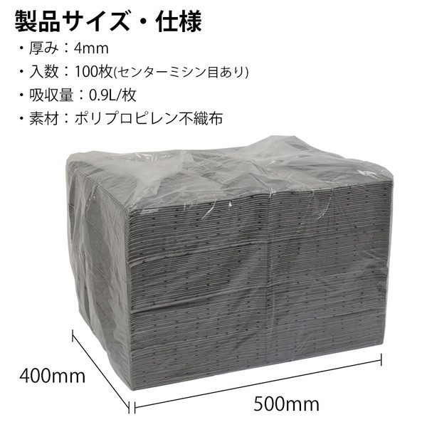 - ■サイズ : 縦400mm x 横500mm (厚み4mm) ■吸収量 : 0.9L/シート ■素材 : ポリプロピレン不織布 ■色 : グレー ■保管 : 湿度50%以下の乾燥した場所推奨