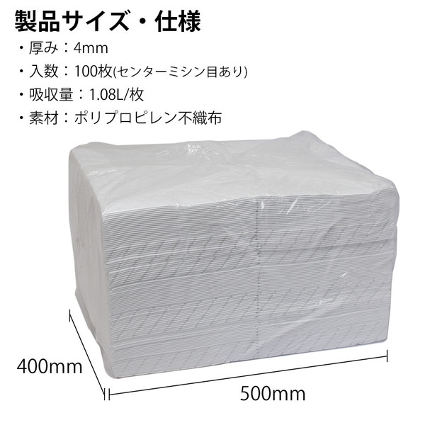 - ■サイズ : 縦400mm x 横500mm (厚み4mm) ■吸収量 : 1.08L/シート ■素材 : ポリプロピレン不織布 ■色 : ホワイト